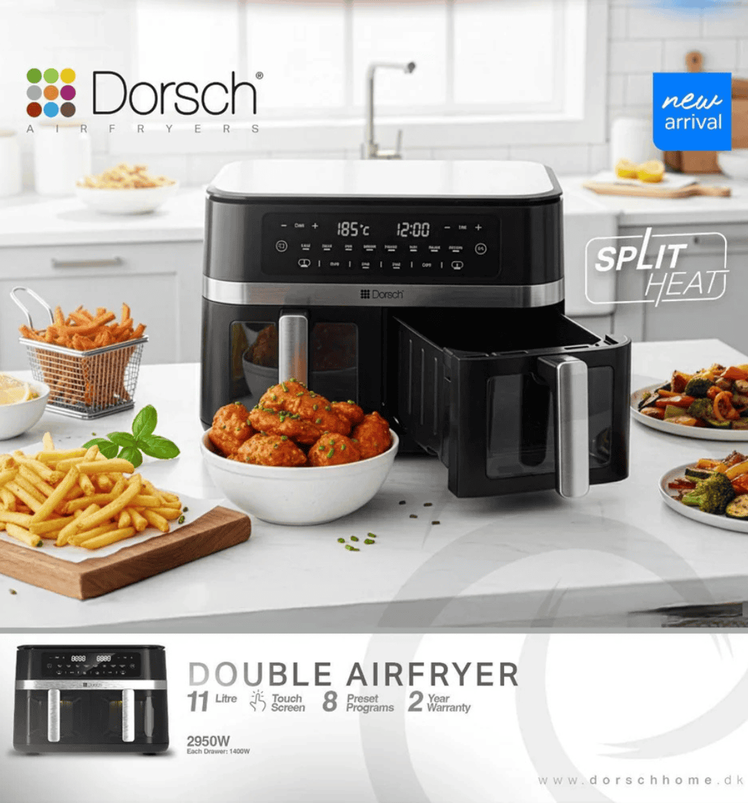 The Dorsch Dual Air Fryer DH-07822 is a powerful 11-liter digital air fryer designed for healthier cooking with little to no oil. Equipped with dual independent baskets, it allows you to prepare two dishes at the same time with different settings — saving time while keeping flavor and crispiness at its best. With advanced rapid air circulation technology, multiple cooking modes, and a modern digital touch interface, this air fryer brings convenience, versatility, and professional-grade performance to your kitchen.