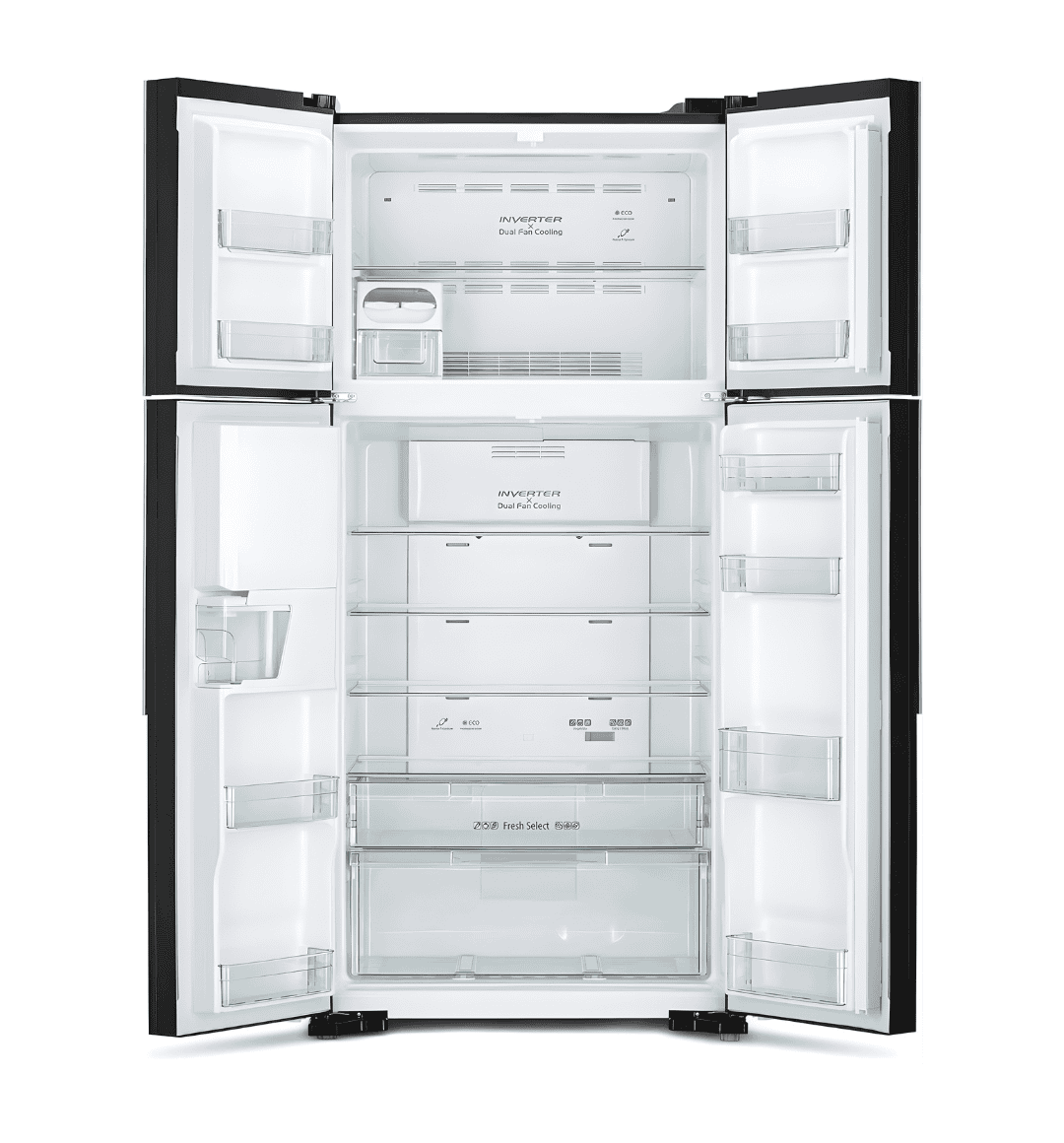 The Hitachi R-W760PUK7GBK is a premium 4-door refrigerator designed for modern kitchens, offering 760 litres of storage capacity to accommodate large families or bulk groceries. Its advanced cooling technology ensures optimal temperature control for both fresh and frozen foods, preserving nutrients and extending freshness.