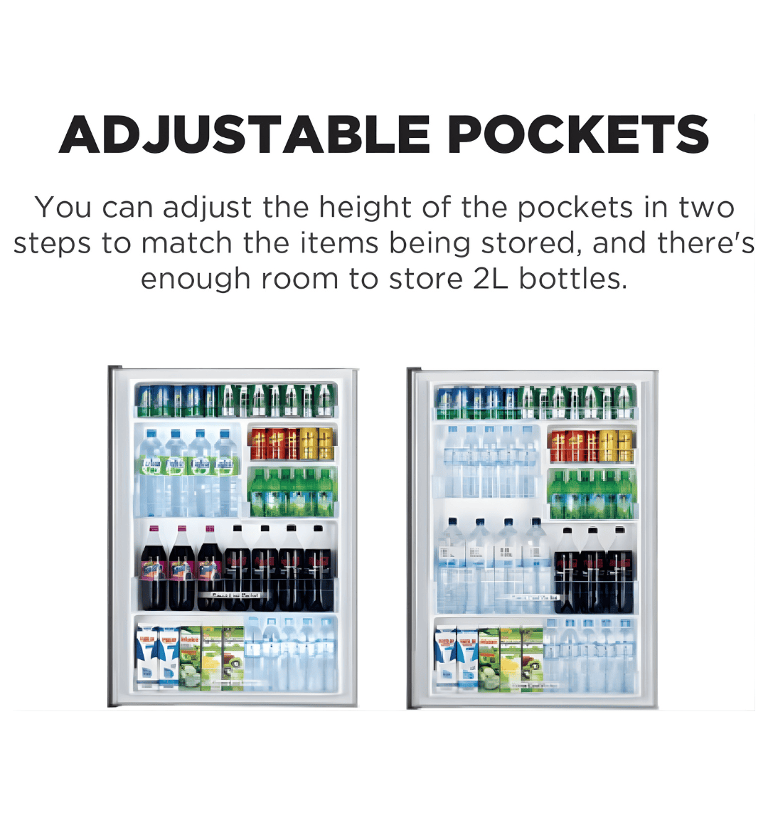 Adjustable Shelves: Flexible storage options for containers of different sizes.