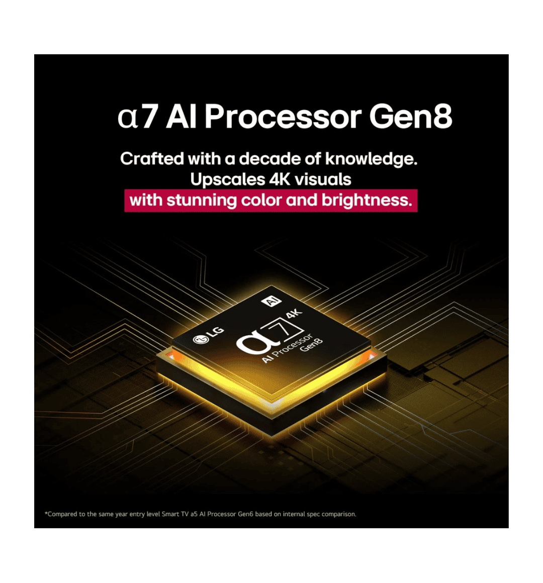 With a powerful 20W 2.0 channel speaker system, enhanced by α7 AI Sound Pro (Virtual 9.1.2), enjoy immersive audio that adapts to your space using AI Acoustic Tuning.