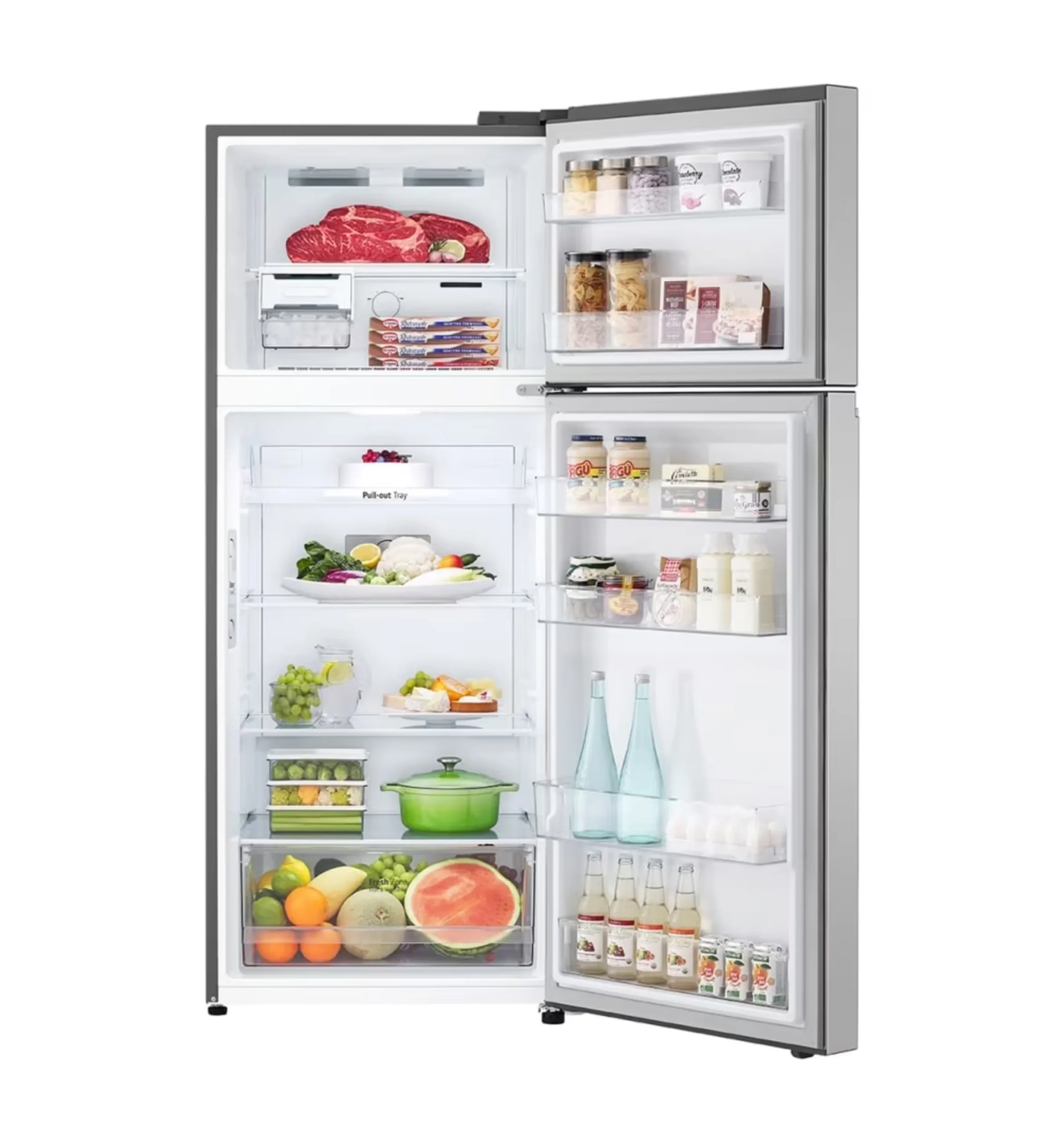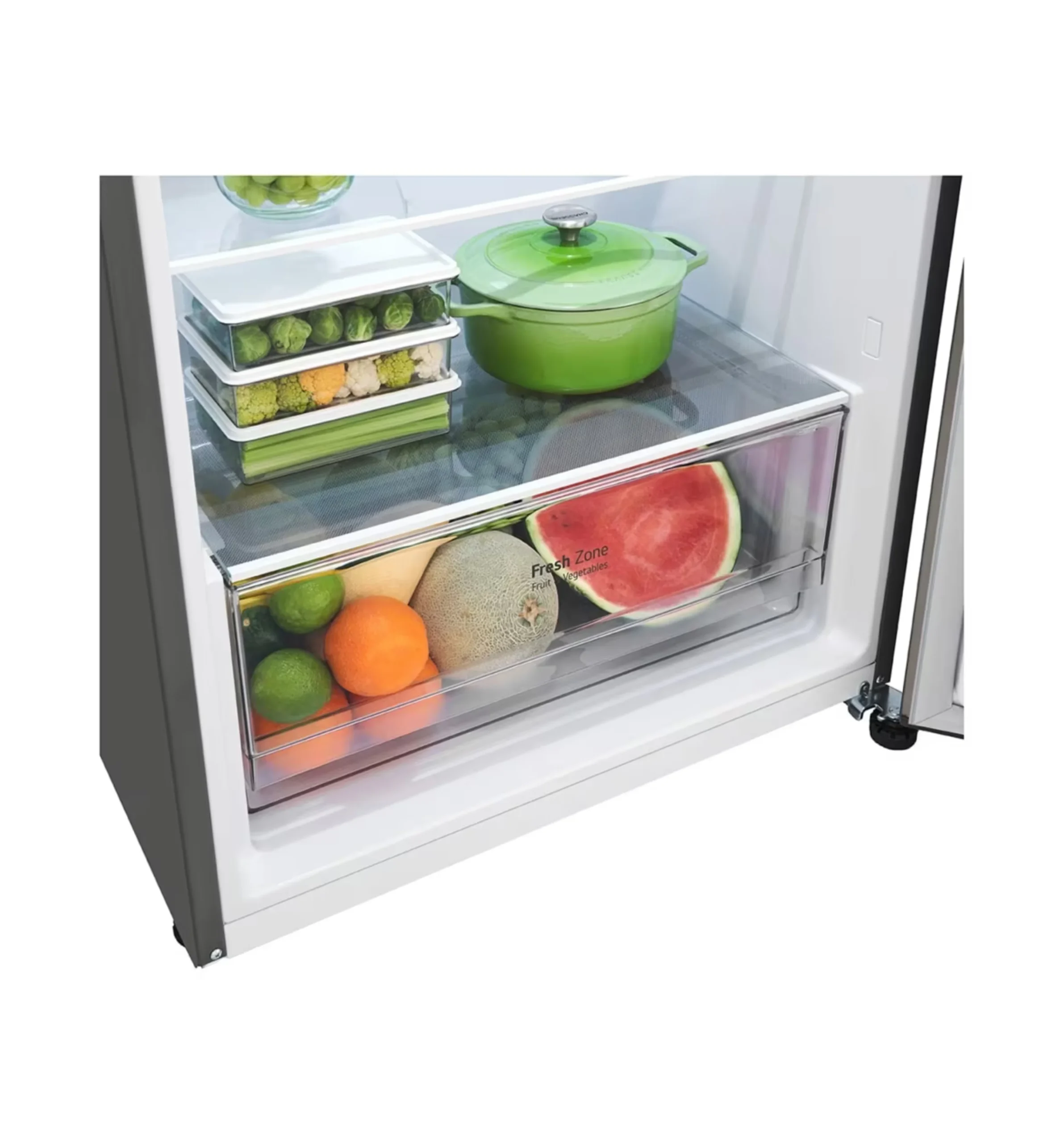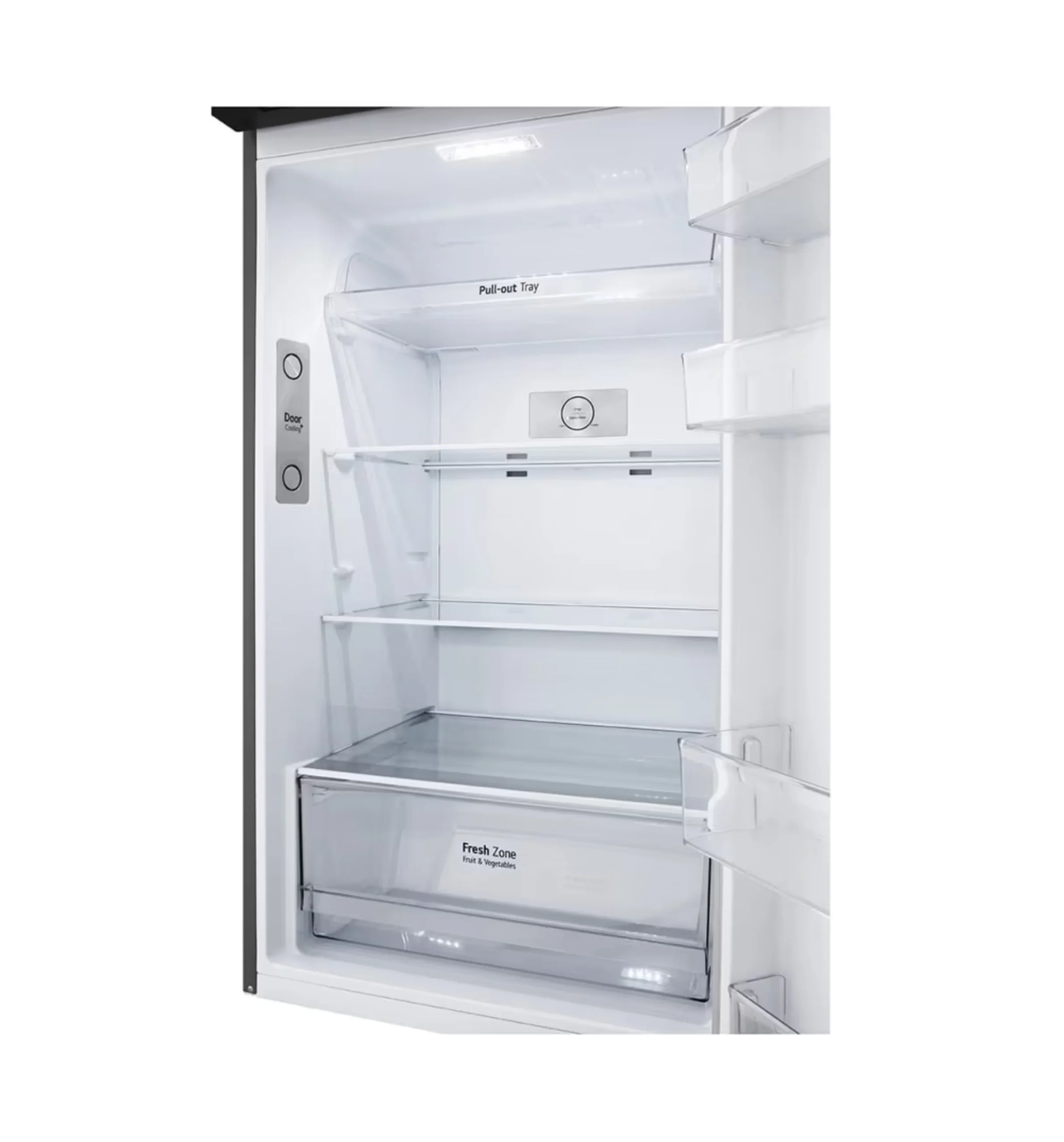 Powered by LG Smart Inverter Compressor, this refrigerator ensures energy-efficient operation, quiet performance, and long-lasting durability. The Door Cooling+™ technology delivers faster and more even cooling throughout the fridge, helping maintain optimal freshness for drinks, fruits, and everyday foods.