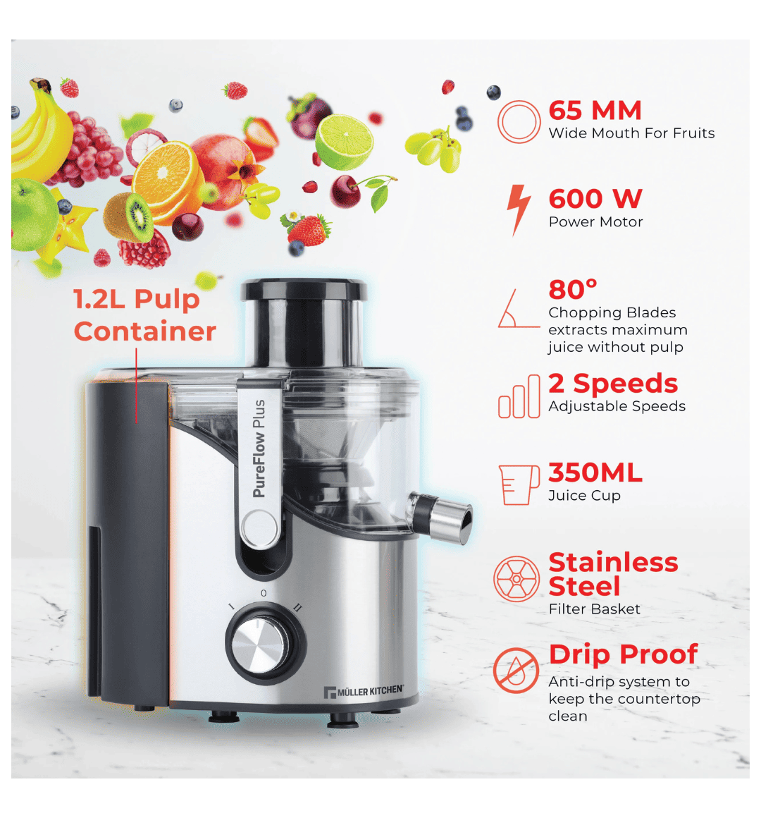 The MULLER KOCH MK-6073 Pureflow Plus Juicer Extractor is designed to deliver fast, efficient, and nutrient-rich juice from your favorite fruits and vegetables. Powered by a strong 600W motor, it provides smooth and consistent extraction with minimal effort.