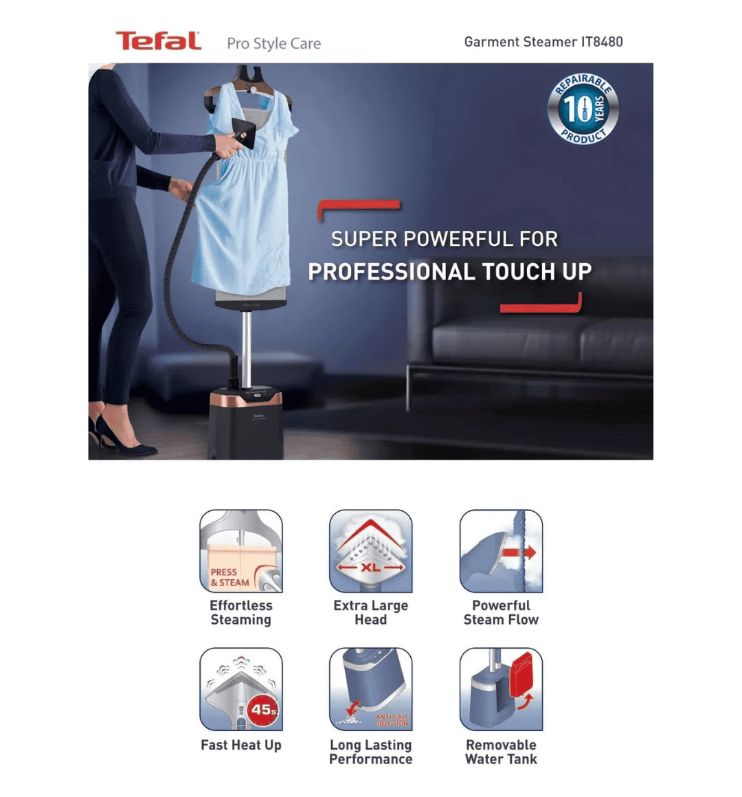 The Tefal Pro Style Garment Steamer IT8480 is a powerful and efficient upright steamer designed to remove wrinkles from all types of fabrics safely and effortlessly. With a 2000W motor and a 1.3L water tank, it provides continuous steaming for long sessions, making it ideal for home or professional use. Portable and easy to use, it comes with convenient accessories for a complete garment care solution.